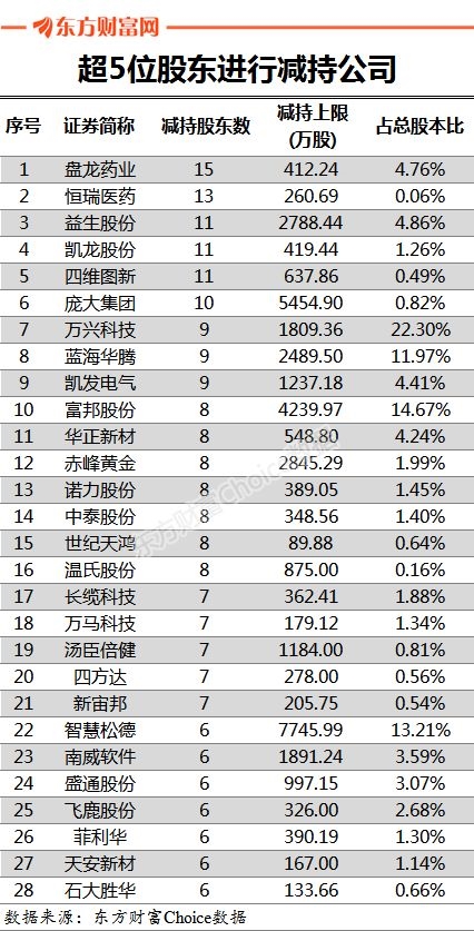其中盘龙药业排在首位,共计15位股东进行股份减持,合计减持股数上限412.24万股,占其总股本比4.76%。