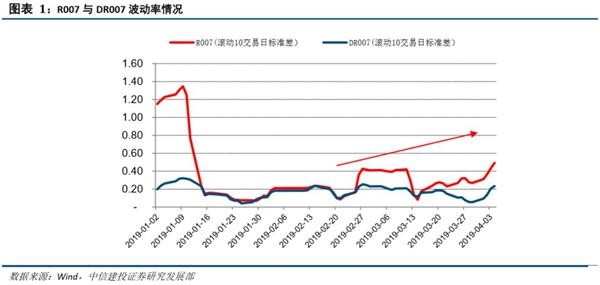 上周央行公告表示,由于目前银行体系内流动性总量处于较高水平,可吸收政府证券发行缴款等因素的影响,4月4日暂不开展逆回购操作。从利率走势来看,上周货币利率下行,国债利率上行。截至2019年4月4日,R007与DR007对应利率分别为2.24%与2.27%,较年初下降37BP与20BP。尽管银行间市场仍然较为宽松,但是我们了留意到3月市场短端银行间市场波动性远大于2月,短期供需失衡时有发生。依据《信用宽松与牛市全景》,中国银行体系再信用供给中面临着三大实质性约束:(1)资本金约束、(2)流动性约束、(3)利率传导不畅导致的需求约束。资本金初步得到补充下,商业银行的风险偏好将上升,2月社融总量上行已经充分证明了宽信用的有效性。我们认为随着银行信贷投放逐步恢复,法定准备金消耗增加,资金面逐步趋紧,货币市场波动性加大。