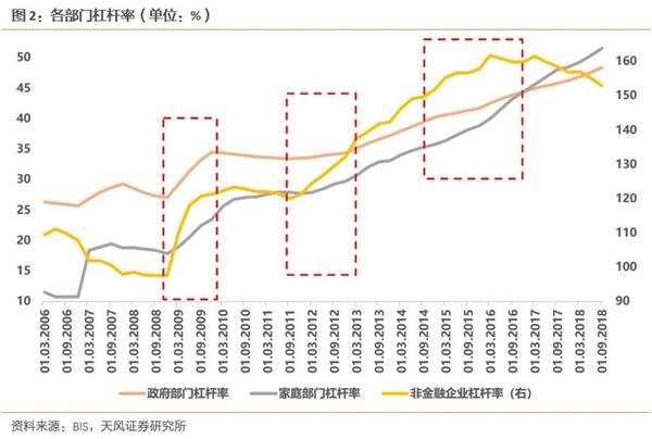 从分部门杠杆率的走势也能看到,过去十年每一次杠杆率曲线的斜率变陡峭,都对应着政策转向宽松的区间。