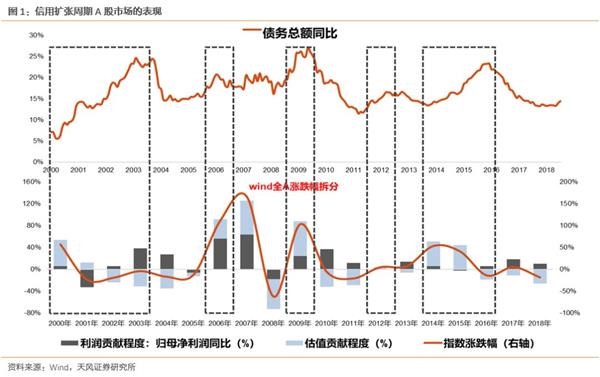 年初以来,我们用“债务总额同比增速”来衡量的信用周期,已经出现非常明确的拐点。从2000年开始,中国一共经历了5轮信用扩张的阶段(图1方框中)。每一轮信用扩张的周期,对应到A股市场中,我们都可以发现一些明确的规律: