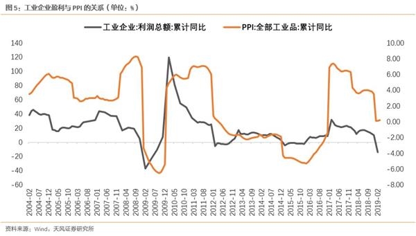 2018年的5-8月是PPI基数最高的阶段,单月同比都在4%以上,对应2019年的5-8月,如果不出现新的涨价因素,那么通缩的概率就非常大,也是同时是工业企业盈利今年二次探底的阶段。