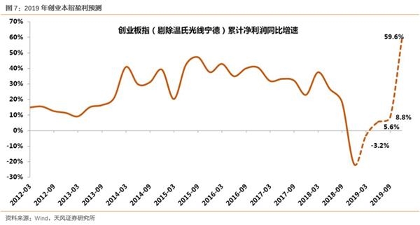 (2)根据19Q1全部披露的业绩预告和上述业绩分布情况,推算全年各季度创业板指(剔除温氏、光线、宁德)累计净利润同比增速: