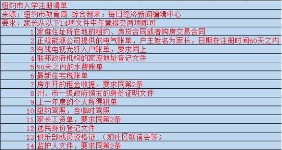 ▲纽约市入学注册清单,要求家长从14份材料中任意提交两项即可来源:纽约市教育局