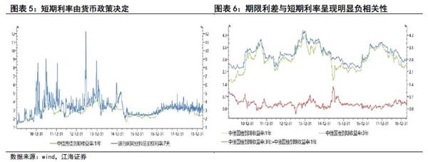 首先,如何理解利率债的期限利差,即短期无风险利率与长期无风险利率之间的关系是什么?分别来看两者的影响因素,短期利率基本由货币政策决定,一个简单的例证是7天同业拆借利率(可视为货币市场收益率)与1年期国债收益率走势高度一致;而长期利率则是在现有短期利率的基础上叠加市场对未来短期利率的预期(预期理论)。因此,在经济和货币政策周期的不同阶段,会形成牛平、牛陡、熊平、熊陡等不同的利率曲线变化。比如货币政策保持中性的时期,如果经济预期改善,那么长期利率将会上行,导致期限利差走阔。从实践来看,相比市场预期,短期利率对期限利差的影响更强,两者呈现出显著的负相关性。也就是说,利率债的期限利差主要取决于短期利率的走势。