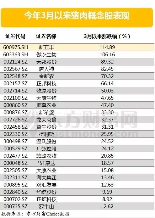 A股方面,据东方财富Choice数据显示,自3月以来,24只猪肉概念股几乎集体上涨,其中新五丰、傲龙生物股价涨幅已超1倍,另外天邦股份、唐人神、金新农、正邦科技以及牧原股份则涨超50%。