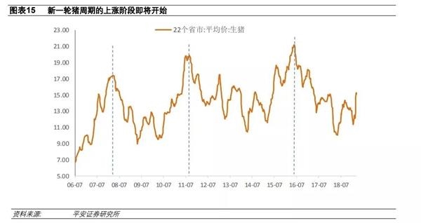 平安证券也认为,猪价可能在未来两个月加速攀升,原因有两方面:第一,夏季是非洲猪瘟传播的温床,根据非瘟疫情发酵的季节性规律,从 5 月开始,我国国内的非瘟疫情有逐步重新变得严峻的可能;第二,今年将进入新一轮猪周期的上涨阶段,我国猪周期上涨、下跌阶段的时长在 15 个月至 31 个月之间;最近的一轮猪价下跌阶段从 2016 年 5 月开始,距离 2018 年 5 月的相对低点已有 24 个月,距离 2019 年 2 月的相对低点则有大约 33 个月,从时间上看,新一轮猪周期的上涨阶段可以说已经蓄势待发。
