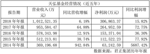 4月18日晚间,天弘基金第三大股东君正集团(601216)披露了2018年年报,天弘基金2018年的经营情况也随之浮出水面。2018年,天弘基金营业收入为101.25亿元,同比增长6.18%,净利润为30.69亿元,同比增长15.82%。