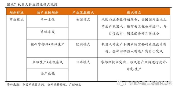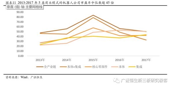 同一行业处于不同产业链,企业的估值有着明显的差别。对于机器人行业来说,机器人企业的商业模式可分为单一本体制造商、系统集成商、核心零部件、本体生产+系统集成、全产业链体系五种模式。核心零部件商业模式的企业估值更高。