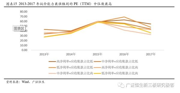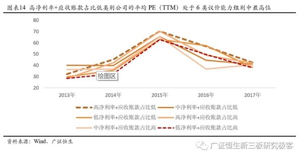 2013-2017年6类议价能力不同的组别PE(TTM)中位数情况:议价能力最高的“高净利率+应收账款占比低”组别的市盈率平均中位数为49.86倍,位于估值最高水平;“中净利率+应收账款占比低”平均中位数为48.47倍;“低净利率+应收账款占比低”平均中位数49.26;“高净利率+应收账款占比高”平均中位数42.71倍;“中净利率+应收账款占比高”平均中位数41.32倍;“低净利率+应收账款占比高”平均中位数42.11倍。