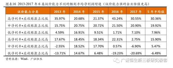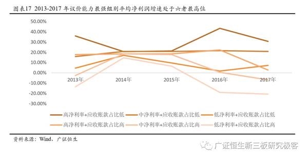 议价能力不同的6个组别平均盈利增速情况:2013-2017年议价能力最强的“高净利率+应收账款占比低”组别其平均盈利增速水平最高,为30.36%,而议价能力最低的“低净利率+应收账款占比高”组别其盈利增速为-6.49%,处于最低增速水平。