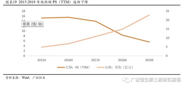 目前我国上市的机器人企业中有相当部分企业属于初创阶段,采用PE估值方法对企业进行估值不适用,应转换为采用PS方法进行估值。PS会随着公司营收规模扩大而下降,营收规模越大的公司PS较低。以国内全产业链的机器人公司之一的埃斯顿为例进行分析。