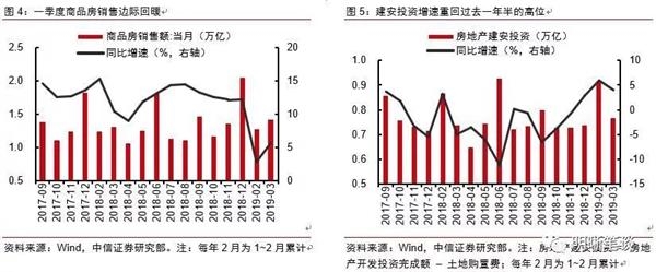销售与投资增速的背离,反映的是去年到今年从紧信用到宽信用的转变。去年表外融资收缩,房地产企业资金紧张,房企有明显的早销售早回款、晚开发晚付款的提高资金周转率的倾向。这既反映于我们曾在《债市启明系列20190325—黑色上涨源于需求回暖还是供给限产》中分析过的房地产开工、完工面积增速的背离,也反映于销售和投资增速的背离。2018全年房地产销售额同比增加12.2%,但是建安投资却同比减少3.2%;2019年前3月,销售额同比降至5.6%,建安投资同比却反弹至5%。资金面的宽松无疑增加了地产商投资的力度,短期内建安投资可以忽视销售的下滑发生反转,但是长期产业链的景气仍需终端销售的支持。问题在于,房地产销售的小幅回暖能否持续?