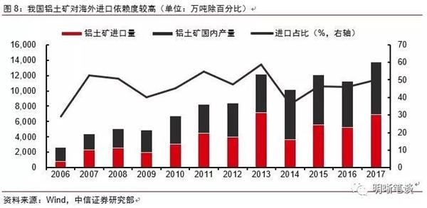 作为铝加工产业链最上游的铝土矿,我国对海外供给依赖度较高。中国铝土矿储量在世界范围内相比较低,根据国家统计局数据,2016年底探明储量约为10.1亿吨,仅占储量第一的几内亚的约14%,且我国铝土矿品质较差,98%以上为加工困难、耗能高的一水硬铝石。但是由于需求拉动,我国是全球铝土矿产量第二大国,据Wind数据,2017年国内产量为6902万吨,仅次于澳大利亚的8942万吨。可以说我国正以不足全球3%的储量生产着全球25%的铝土矿。但是即便如此,我国对海外供给的依赖度依然较高,2018全年进口铝土矿8262万吨,过去十年国内每年消费的铝土矿约50%来源于进口。