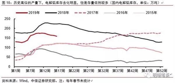 三月以来电解铝库存去化明显,但是存量水平依然较高。根据阿拉丁数据,今年1~2月国内电解铝产量585万吨,同比仅增0.9%;据统计局数据,3月电解铝产量288万吨,同比增加3.4%。虽然亏损和政策限产等因素导致产量增速不高,但是产量水平仍处于历史高位。三月以来电解铝库存去化明显,显示需求明显回暖。然而当前库存水平虽较2018年整体有所减少,仍明显高于2015~2017三年。居高不下的存量库存,以及因亏损导致的大量闲置产能,限制了需求回暖所能拉动的价格上限,行业整体仍处于供给过剩的状态。