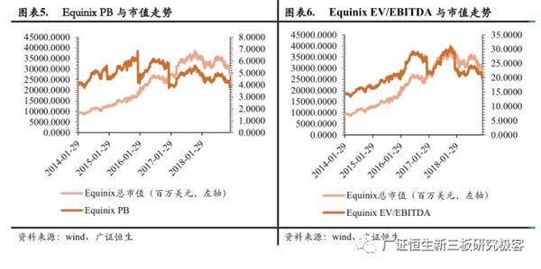 查阅相关数据,我们发现,光环新网PS在9.7-21.3X之间,Equinix PS在3.9-6.0X之间;光环新网PB在4.3-9.4X之间,Equinix PB在3.7-5.6X之间;光环新网EV/EBITDA在29.5-64.1X之间,Equinix EV/EBITDA在13.2-17.5X之间。可以看出,光环新网PB较PS与EV/EBITDA更为稳定。