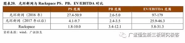 光环新网与2016年发展了IaaS业务,因此16年可以界定为其IaaS业务前期。根据我们的整理,光环新网16年PS在27.4-50.9X之间,PB在2.6-5.0X之间,EV/EBITDA在97.0-179.0X之间。可以看出其PB值波动最小,同时三种估值方法中PB估值与Rackspace相差最小,因此IaaS前期适宜PB估值。而2017以后,光环新网则步入IaaS业务的快速发展期,其PS在4.1-9.7X之间,PB在2.4-3.5X之间,EV/EBITDA在25.9-46.3之间,与Rackspace对比,PS与其最为接近,验证了IaaS快速发展期PS估值的适用性。