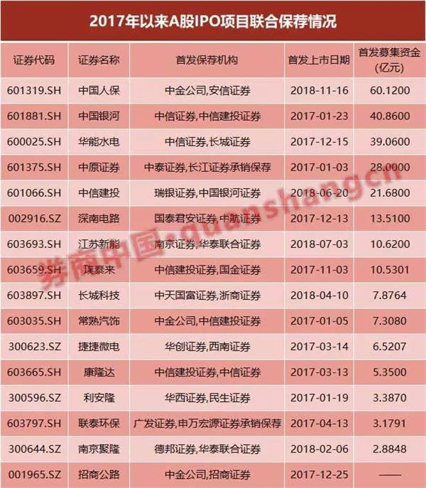 剔除招商公路项目,去年11月份上市的中国人保IPO实际募资60亿元,似乎不满足IPO项目100亿元才能采用联合保荐的形式。不过记者了解到,人保最初拟定发行45.99亿股,后来发行数量缩减到18亿股,最终募资60亿。“因为最初募资金额比较大,证监会建议联合保荐。”有知情人士对记者透露。