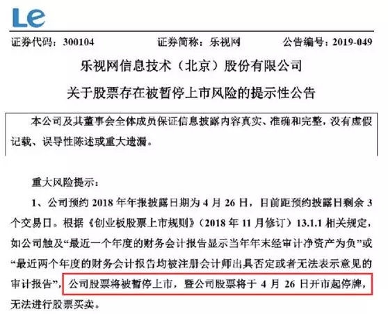 4月22日晚20时许,乐视网再发暂停上市风险提示性公告。乐视网公告显示“公司 2018 年度归母净资产预计为负,公司股票将被暂停上市。2018年净利润预计为亏损。股票将于4月26日开市起停牌”。