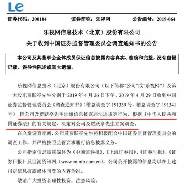 乐视网在公告中表示,公司及第一大股东贾跃亭分别于2019年4月26日下午、2019年4月29日收到中国证券监督管理委员会《调查通知书》(稽总调查字191339号、稽总调查字191341号),因公司及贾跃亭涉嫌信息披露违法违规等行为,根据《中华人民共和国证券法》的有关规定,决定对公司及贾跃亭立案调查。