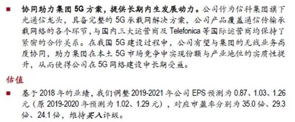 中银国际证券认为,公司作为信科集团旗下光通信龙头,具备完整的5G承载网解决方案,公司产品覆盖通信传输承载网络的各个环节,与国内三大运营商及Telefonica等国际运营商均保持了紧密的合作关系。在我国5G建设过程中,公司有望与集团的无线业务高度协同,助力集团在本土5G市场竞争中实现份额与产业地位的实质性提升,从而使得公司在5G网络建设中长期受益。