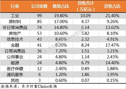 根据国际行业分类标准(GICS),在业绩500强公司中,来自工业行业的上市公司最多,共有99家,占比为19.80%;原材料行业同样为500强的高产行业,有85家。另外,非日常消费品、房地产、信息技术等行业进入500强的企业数量也较多,分别74家、53家、43家。