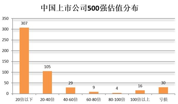 从估值来看,500强企业中以低估值的公司居多。其中,市盈率在20倍以下的公司数量有307家,占比61.4%。当然,其中也有不少企业估值较高,市盈率超过60倍(包括亏损企业)的企业有59家,占比11.8%。