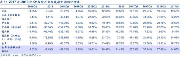 2019Q1全A(非金融石油石化)业绩超预期,核心推动主要来自于主板公司。根据18年报和2019一季报,2019Q1中小创负增长(分别为-5.17%和-14.78%),而主板的归母净利润增速为11.35%,相较于2018Q4单季度的-23.87%明显改善;进一步剔除两油和金融,2019Q1主板(非金融石油石化)归母净利润增速为6.44%,相较于2018Q4(剔除两油金融)的-36.54%同样大幅提升。这点也可以在最新公布的工业企业利润中得到验证和解释。2019Q1同比下降3.3%,降幅环比收窄10.7pct。其中,3月份同比增长13.9%。根据统计局给出的解读,主要是由于工业品价格企稳回升与石油加工、钢铁、化工等重点行业利润明显回暖推动。