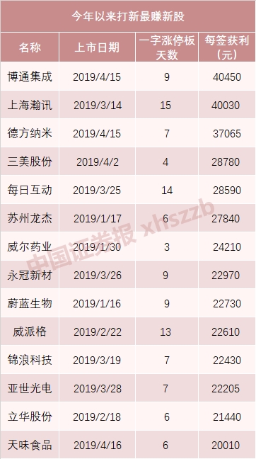 数据显示,今年以来沪深两市共有41只新股上市,38只已开板新股的平均一字涨停板数量为7.39个。3月至今,两市共有21只新股上市,18只已开板新股平均收获了7.89个一字涨停板。4月中旬上市的博通集成收获了9个一字涨停板,每签获利达到40450元,超过上海瀚讯成为今年到目前为止打新最赚钱的新股。截至目前,在今年以来的上市新股中,每签获利超过2万元的共有14只,超过4万元的有2只。