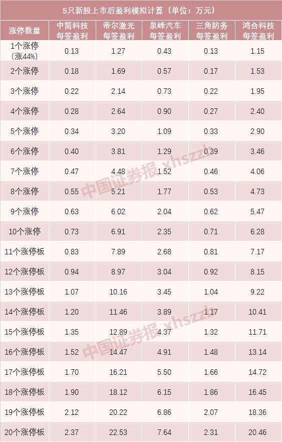 如果中简科技帝尔激光泉峰汽车三角防务鸿合科技5只新股上市后,能达到今年以来上市新股的平均水平——7个涨停板的话,则每签获利分别约为0.47万元、4.48万元、1.52万元、0.46万元、4.06万元。