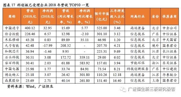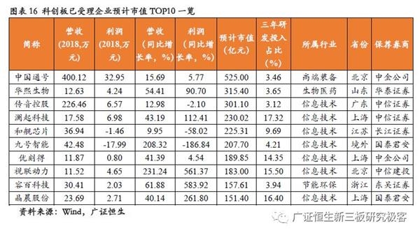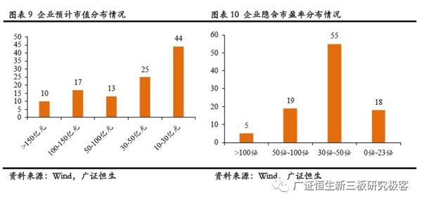 我们根据每家已受理企业招股书中披露的预计募资规模以及新发股本占发行后总股本之比,推算出企业发行后的预计总市值,并根据2018年的归母净利润与扣非净利润熟低者,计算出企业隐含市盈率。