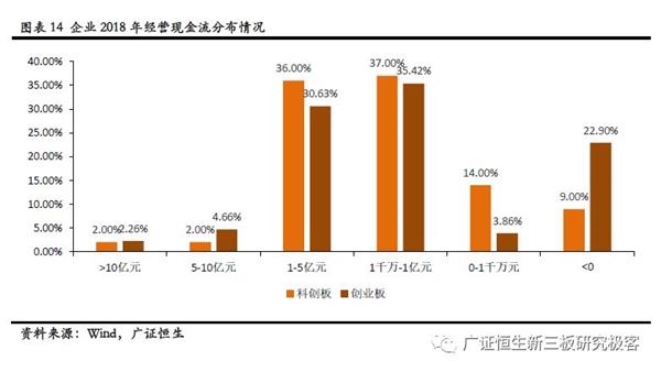 经营现金流方面,科创板企业的平均现金流为1.44亿元,中位数为7200万元,与创业板水平相当。科创板和创业板企业的经营现金流都主要集中分布于1千万-1亿元之间,与其中科创板有不到10%的企业经营现金流为负值,而创业板有超过20%的企业经营现金流为负。