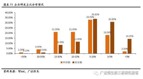 研发投入占比方面,科创板已受理企业在2016-2018年三年间研发投入占营业收入的平均比例为11.70%,高于同期创业板6.35%的水平。由图可看出,科创板企业的研发占比主要集中于5-30%之间,而创业板则集中分布于3-10%之间,科创板企业的研发占比略多于创业板企业。
