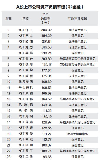 证券时报·数据宝与中国上市公司研究院联合发布的2018年A股“上市公司资产负债率榜(非金融)”显示,上榜的100家公司中最低资产负债率水平为85.52%,44家ST公司上榜;54家公司年报被出具了“非标”审计意见;22家公司资不抵债,资不抵债公司数量创近五年新高。