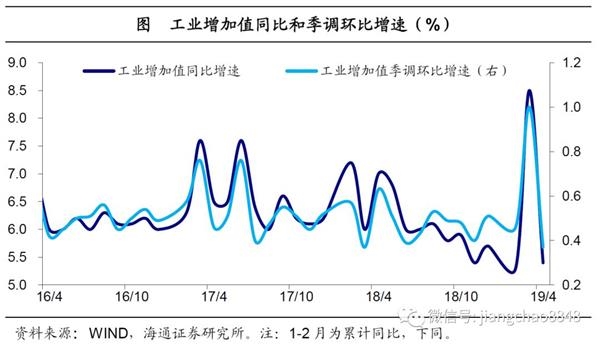 工业增速如期回落。4月份,规模以上工业增加值同比增速5.4%,较3月的8.5%大幅回落,而较1-2月基本持平。而4月工业增加值季调同比增速也显著下滑至0.37%。4月工业增速大幅回落符合预期,原因主要有三个方面:一是增值税率下调令生产前移,二是终端需求依然偏弱,三是去年同期基数走高。