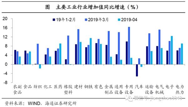 从中观看,17个主要行业增加值增速涨少跌多。具体来看:4月份,下游消费类行业中,食品、医药上升,农副、纺织、汽车回落;中游装备加工类行业中,仅通信电子上升,通用设备、专用设备、电气机械、运输设备、金属制品均回落;中游原材料类行业中,钢铁、电力上升,有色、建材、化工、橡胶塑料均回落。此外,上游采矿业增速也趋于回落。整体看,下游不温不火,中游和上游普遍下滑,是主要拖累。