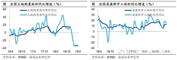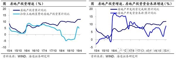 房地产投资增速高位企稳。1-4月房地产开发投资同比增速稳定在11.9%,其中4月当月增速稳定在12.1%。值得注意的是,年初以来,房地产投资结构发生明显变化,1-3月土地购置费增速32.6%,较18年的57%明显下滑,这使得剔除土地购置费前、后的房地产投资增速之间的背离,房地产投资名义、实际增速之间的背离均明显收敛。而房地产开发企业到位资金增速的持续回升,也对施工形成支撑,令房地产投资增速依然稳定在高位。