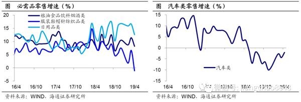 消费回落网购仍强。4月份社消零售名义增速7.2%、实际增速5.1%、限额以上零售增速2.0%,均较3月份下滑。4月消费增速放缓,主要是受“五一”假期错月后移影响,剔除假日移动因素后,4月社消零售增速较3月持平。分品类看,必需消费增速普遍回落,食品饮料、纺织服装、日用品类零售额增速全线下滑。可选消费增速涨少跌多,虽然汽车类零售降幅收窄,但石油及制品类零售,以及地产后周期的家电、家具、建材类零售增速均有所下滑,是可选消费走弱的主因,也抵消了汽车消费回暖的拉动。网购消费依然强劲,1-4月实物商品网上零售增速上升至22.2%,占社消零售比重则升至18.6%。