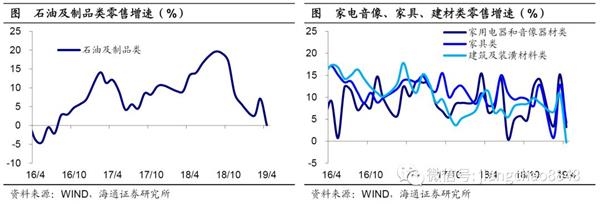 可选消费增速涨少跌多。4月份,可选消费涨少跌多,其中,占比最高的汽车类零售降幅收窄至-2.1%;占比次高的石油及制品类零售增速下滑至0.1%、几近归零;地产后周期的家电、家具、建材类零售增速分别下滑至3.2%、4.2%和-0.3%。整体看,石油及制品类零售,以及地产相关消费的放缓,是可选消费走弱的主因,也抵消了汽车消费回暖的拉动。