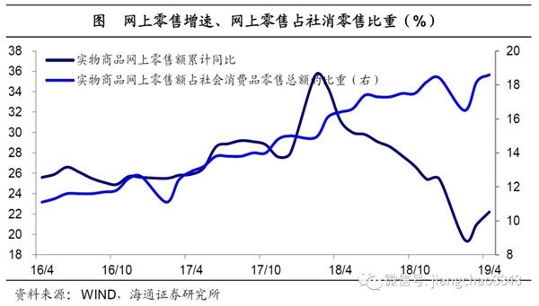 网购消费依然强劲。1-4月份,在社消零售增速小幅下滑的背景下,实物商品网上零售增速仍继续回升至22.2%,占社消零售的比重也创下15年以来的新高至18.6%。