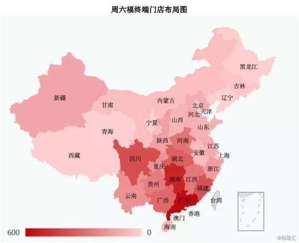 周六福2004年创立于深圳水贝珠宝首饰集中区。截止2018年底,公司在全国31个省市自治区拥有2790家珠宝首饰店,其中加盟店2781家,直营店9家,重点市场为广东、湖南、福建和川渝。