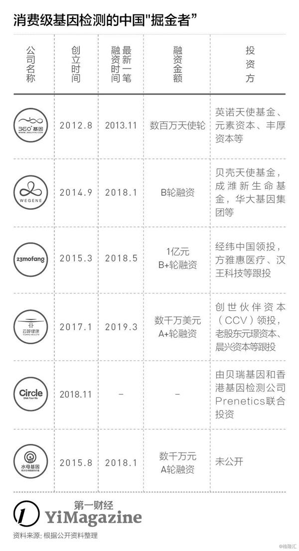 成立于2014年的微基因于2018年1月完成B轮融资,据官方公布,当时其用户数量已经达到10万;2015年,23魔方在成都成立,在2018年3月获得由经纬中国领投的1亿元融资后,时隔2个月又获得了6200万元的B3轮融资;2018年11月,由贝瑞基因和香港基因检测公司Prenetics联合投资的CircleDNA圆基因成立于北京,今年4月中旬,它刚为三款新产品的发布举行了一场发布会……