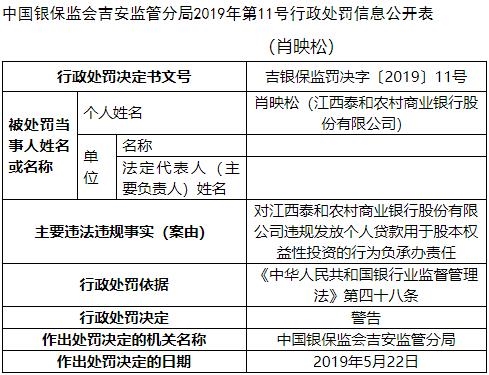银保监会网站近日公布的吉安监管分局行政处罚信息公开表(吉银保监罚决字〔2019〕10号、11号、12号)显示,江西泰和农村商业银行股份有限公司存在违规发放个人贷款用于股本权益性投资、违规办理借新还旧以掩盖贷款的真实风险两宗违法违规行为。《中华人民共和国银行业监督管理法》第四十六条、第四十八条,中国银保监会吉安监管分局对其处以罚款人民币55万元;对肖映松、戴贞潭两名相关责任人警告。