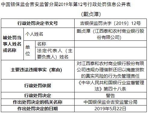 江西泰和农商行两宗违法罚55万 借新还旧掩盖贷款风险