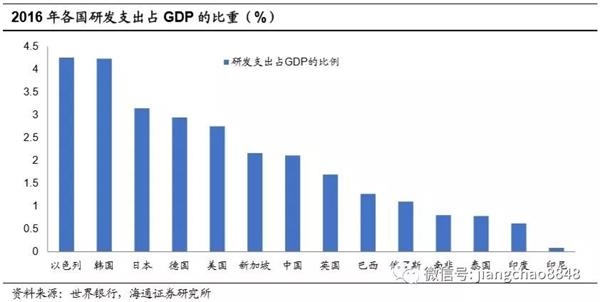 首先,科技创新实力离不开对创新的投入,发达国家普遍创新投入较大,而发展中国家创新投入较少。从研发支出占GDP的比重来看,以色列、韩国和日本研发强度较大,2016年研发支出占GDP的比重分别达到4.25%、4.23%和3.14%。而泰国、印度和印尼研发投入相对较小,研发支出占GDP的比重分别为0.78%、0.62%和0.08%。此外,从研发人员占比来看,以色列、韩国和新加坡平均一万人中有超过60人参与科研活动,而相比之下,印度和印度尼西亚的研究人员每万人中占比不足5人。特别值得注意的是,韩国和以色列的研发支出和R&D研究人员比重均以较为明显的优势领先其他国家。