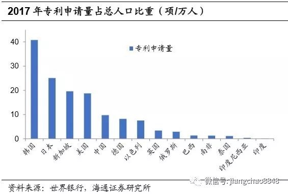 源源不断的研发投入最终形成科技创新成果。从专利申请来看,研发投入占比较大的国家往往科技成果更多。根据世界银行的统计,2017年韩国的专利申请数量为20.5万项,相当于每万人就有40项专利申请,而同时期美国的专利总量有60.7万项,平均每万人也有18项专利申请。此外,日本和新加坡也有较高的人均专利申请量,而南非和泰国平均每万人只有1项专利,印度和印度尼西亚平均每万人专利申请更是不足1项。