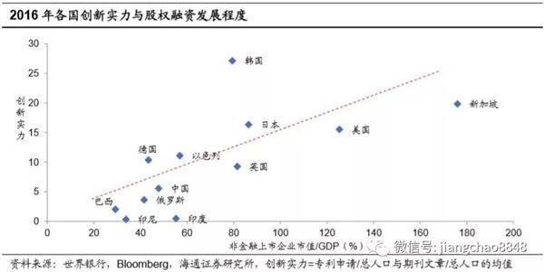 股权融资:培育科技创新的土壤。那么金融如何支持创新?企业性质的变化使得以银行信贷这种间接融资为主的金融体系,很难满足大量科技创新企业的融资需求,而创新本身具有较大的不确定性,其风险收益特征更适合直接融资。在股权融资更发达的国家,科技创新企业更容易获得融资,也就能够加大对研发的投入,推动创新成果的形成和转化。科技创新实力离不开对创新的投入,发达国家普遍创新投入较大,而发展中国家创新投入较少。源源不断的研发投入最终形成科技创新成果。例如以色列、韩国和日本研发强度居前,2016年分别达到4.25%、4.23%和3.14%,这些国家的专利申请以及科技期刊文章数量也处在全世界前列。而结合融资结构看,股权融资市场发展越好的国家,科技创新实力也越强。新加坡的创新实力在众多国家中处于领先地位,新加坡的股权融资发展程度也比较高。美国的创新实力和股权融资的发展也都处于较高水平。而非金融上市公司市值占GDP仅30%-40%的国家,例如巴西、印度尼西亚和俄罗斯,股权融资发展较慢,创新实力也较弱。可以说,事实表明,股权融资的发展是培育科技创新的土壤。