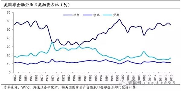 上世纪80年代中期以后,美国股权融资占比大幅上升。到上世纪90年代末,美国非金融企业的融资中,股权融资的占比已经达到60%,较80年代初时的最低水平几乎翻了一倍,并且在随后的较长时间里都维持在55%以上。