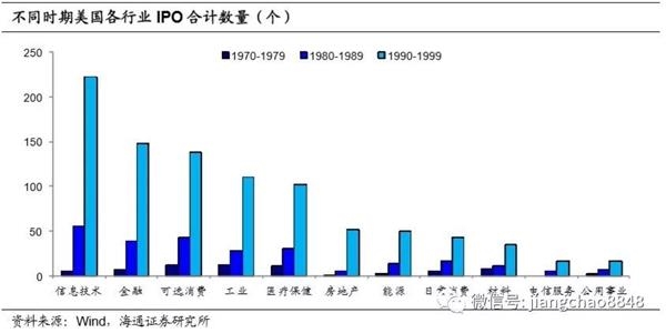 股权融资的发展,对美国企业创新的培育和经济结构的升级功不可没。美国资本市场尤其是股权融资在上世纪80-90年代快速发展,这给提供初创企业的早期投资的天使投资、VC、PE等提供了通畅的退出路径。在此期间,美国IPO的企业数量成倍增长,并且行业分布也发生了变化。70年代,美国IPO数量最多行业的是可选消费和工业,而到了80-90年代,信息技术取而代之,成为IPO企业数量最多的行业,90年代美国信息技术企业上市数量已是工业企业的两倍,为之后美国在信息技术领域强大的竞争力奠定了基础。