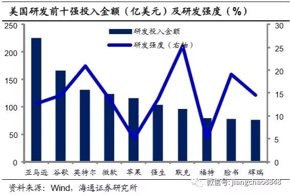 从微观看,科技创新的企业获得资本市场支持,愈发壮大。这些企业通过资本市场获得融资,增加研发投入,最终转化为业绩表现,而在较为完善的市场机制下优胜劣汰,这类创新企业又获得更多的资本支持,形成良性循环,市值也不断提升。1980年美股市值前十大的公司中,7家从事油气领域的业务,而目前,美股市值前十大的公司中一半是互联网和信息技术企业(微软、亚马逊、苹果、谷歌、脸书,即FAAMG),它们牢牢占据市值前五的位置且市值远超第六名,而它们同样也是美国研发强度居前的公司。