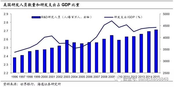 诞生的这些明星公司并不是孤例,其背后是上世纪90年代以来美国科技创新整体实力的增强。在1996-2015的这二十年间,美国研发支出占GDP的比重从2.4%上升至2.7%以上,而每百万人中的R&D研究人员数量从约3000人上升到4300人,增长了近40%,如果看R&D研究人员绝对规模,这二十年间的增长则更是超过60%。